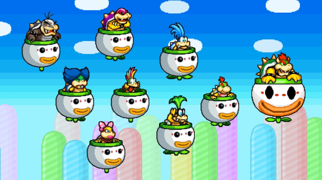 Each of the first seven Bowser Jr.s that spawn in this Event Match will use a costume of one of the different Koopalings. The match starts with just Mario vs. 1 Koopaling but every 20 seconds another Koopaling will spawn in up to a maximum of 3. This continues up through the real Bowser Jr.’s appearance who is then followed by Bowser under the effects of a Super Mushroom.