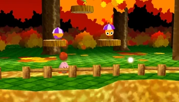 The Autumn Forest is the second stage of Pop Star that Kirby explores during the events of Kirby 64: The Crystal Shards. This area features a peaceful looking forest during the autumn season with a mountainous region nearby. When Kirby gets to the end of this section he runs across Adeleine possessed by Dark Matter. After Kirby defeats her painted foes he manages to free her of Dark Matter’s influence and convinces her to join him on his journey.