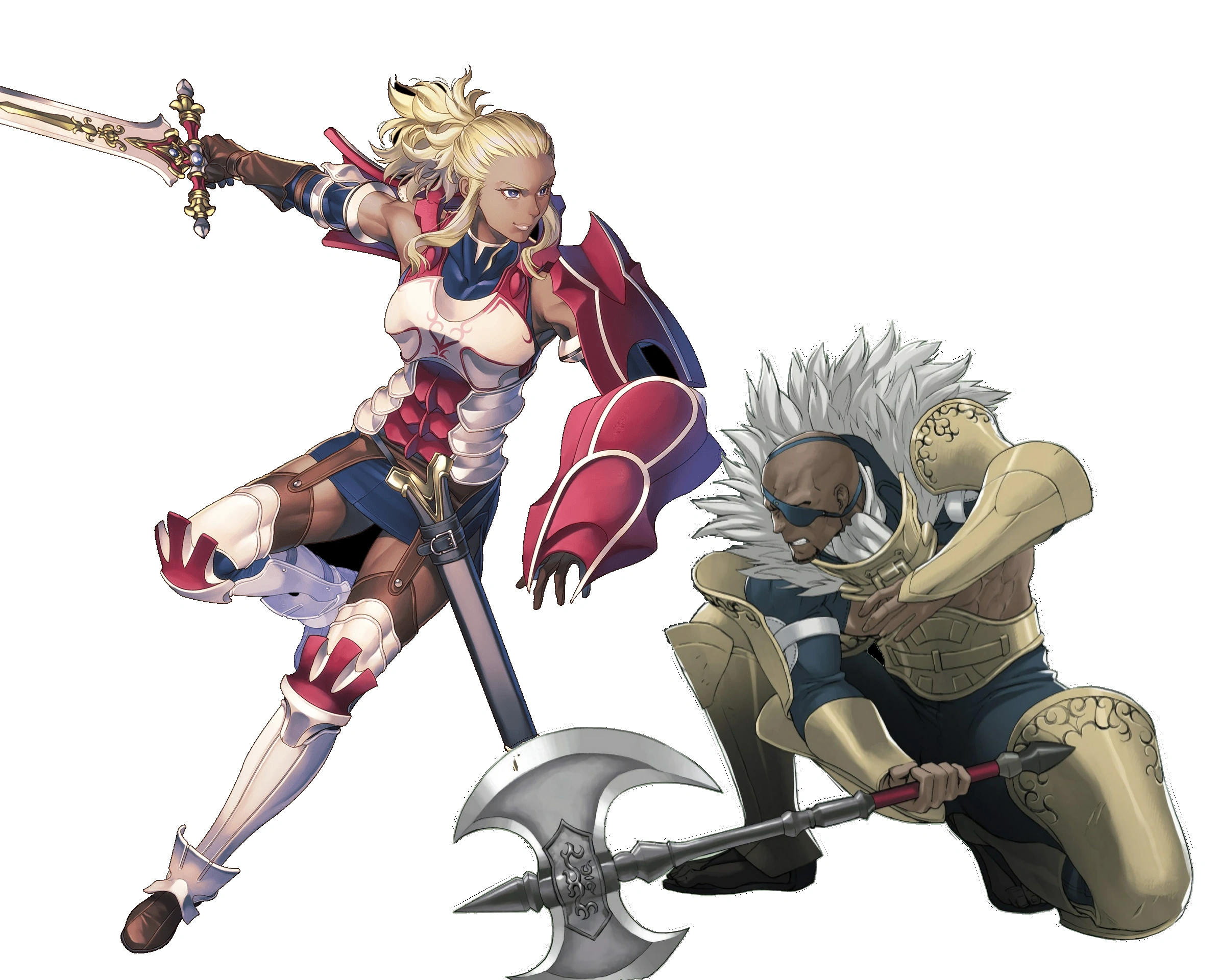 Basilio & Flavia are the respective West- and East-Khans of Ferox. They have a friendly rivalry, dishing out blows against one another at the Feroxi Tournament. When Lucina defeats Lon'qu, Basilio's champion, in battle, Chrom becomes Flavia’s champion; she tells him that if he wants Ferox’s help against Plegia, that he must fight on her behalf versus “Marth” and win her the khanship. throughout the events of Fire Emblem Awakening. The two stick together throughout the war in Ylisse, joining Chrom, Lucina, and Robin's efforts to defeat Grima.