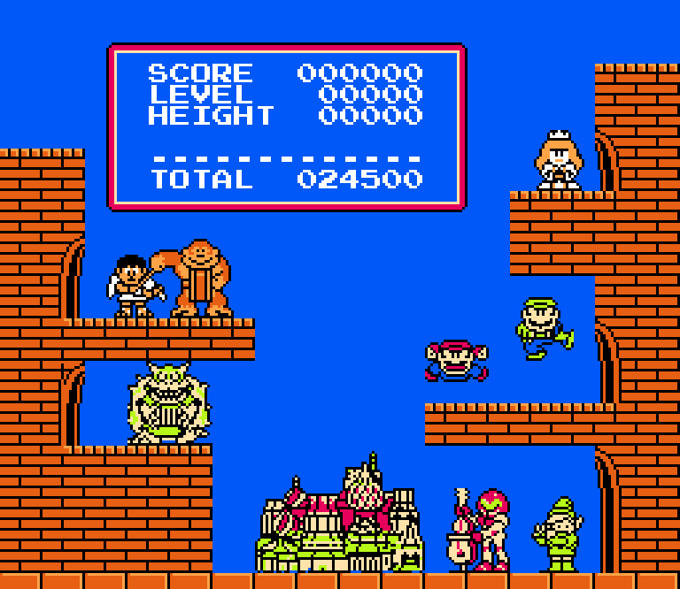 Finishing a Type B game in the NES version of Tetris congratulates players as some of Nintendo's finest play a rousing rendition of the French operatic composition, "The Habenera", from Carmen. You've got Mario and Luigi dancing a convincing Russian jig as Peach claps along, Link on flute, Bowser on the accordion, Donkey Kong on the marching drum, Pit on violin, and even Samus on cello!