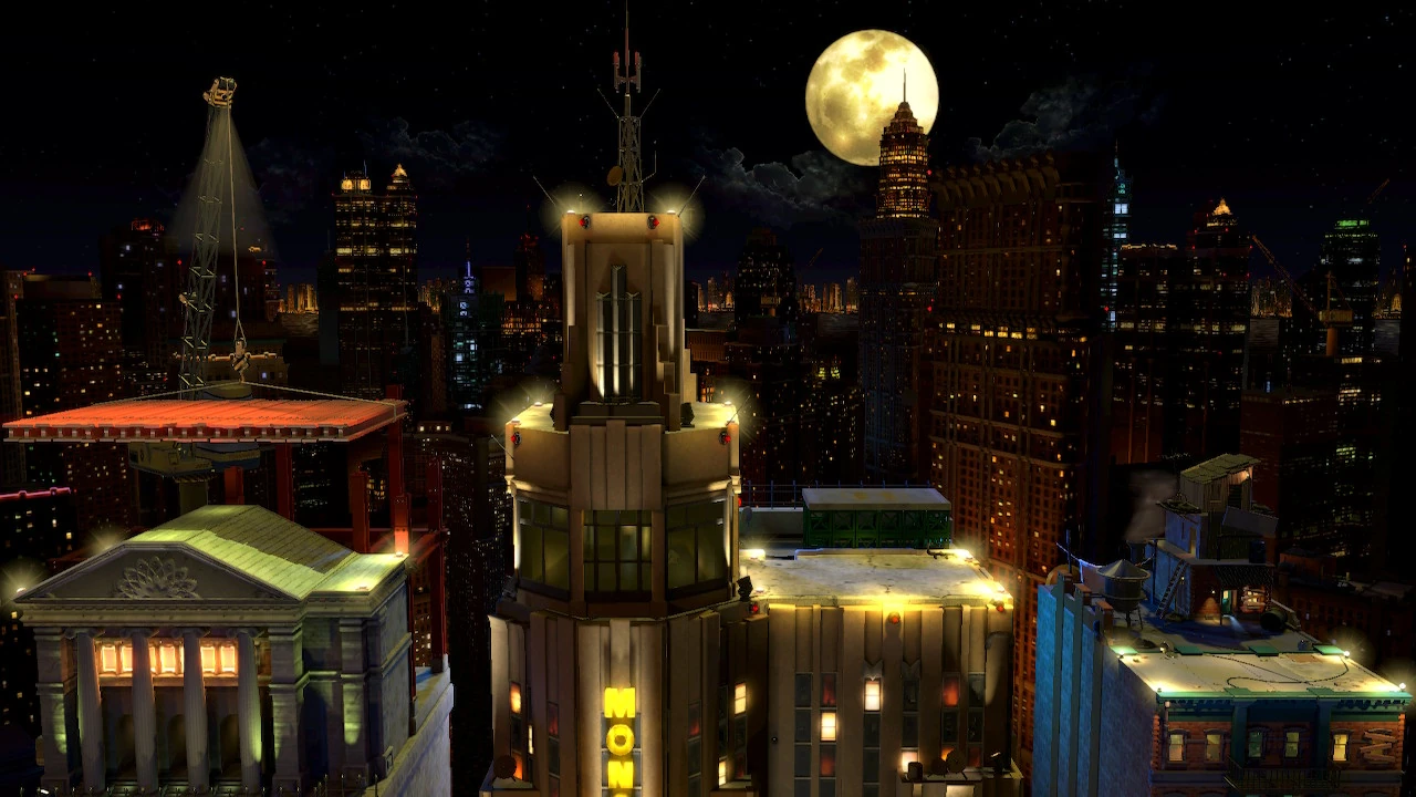 Fighters will be battling out on the rooftops of some of Fourside’s skyscrapers including the Monotoli Building in the center. The Monotoli Building is the largest building with its rightside having a much lower roof than the left. The left side has a really short platform at its peak, but below that has two small ledge platforms on either side of the building’s peak. A short gap is between the Monotoli Building and the two buildings to its left and right which allows for fighters to try and wall jump through as a form of recovery if they have the ability to do that.