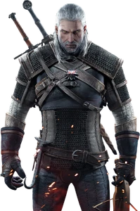 Geralt is a witcher—a warrior who has undergone extensive training, conditioning, and rituals in preparation for their role as a monster-slaying mercenary. He is said to hail from Rivia, but in truth was left by his mother in Visenna before training under Vesemir at the School of the Wolf in Kaer Morhen. The tales of his relationships with the sorceress Yennefer and his child surprise, Ciri, have become something of legend—perhaps in due thanks to the efforts of one particular spoony bard. Geralt's skills as a witcher surmount most in their history, expressing an abnormally high tolerance for mutagens. These rendered his hair white, but gave him an advantage in speed, strength, and stamina above his witcher contemporaries.