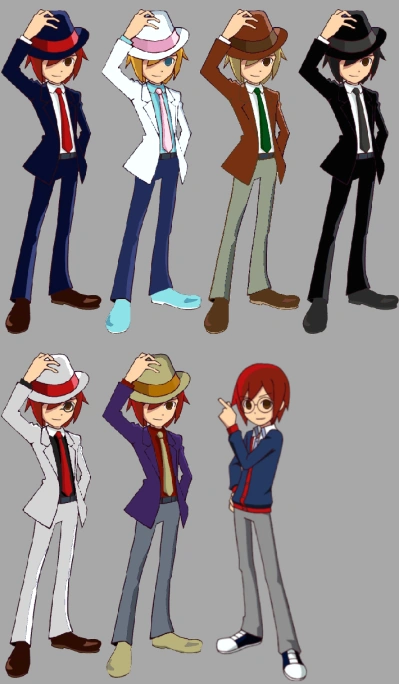 - Backup Dancers - Black hair, hat, jacket and pants, white shirt, grey tie