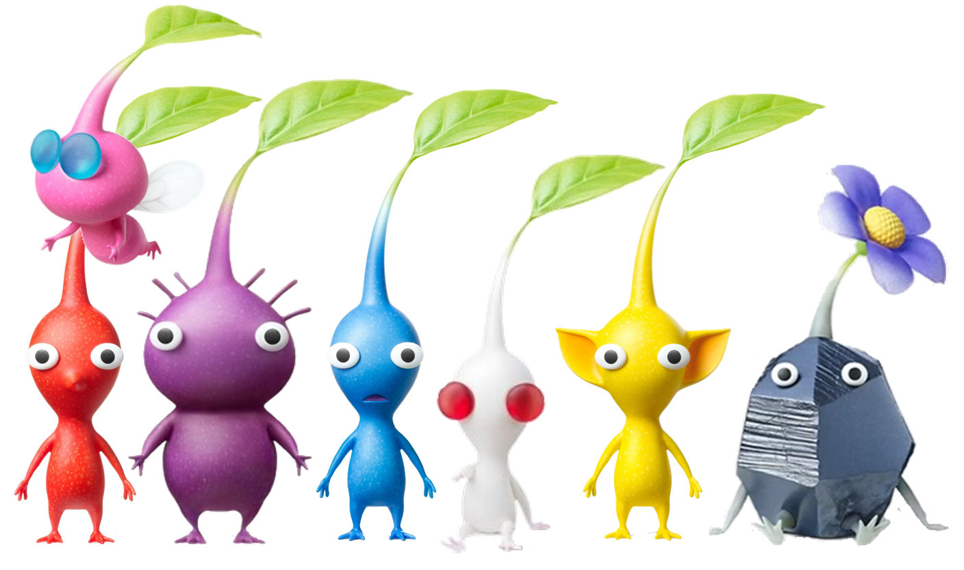 Pikmin are a sentient plant species found on PNF-404, created by spaceship-like structures called Onions who first produce them as seeds. Rallied by the likes of Olimar, Alph, and others as their leader, these intrepid spacefaring captains learn to live and work with the Pikmin on their explorative quests. One Pikmin may not be strong on its own, but together, they can achieve great feats—like retrieving appropriate rations to survive the day, building (and breaking) bridges and other impressive structures, and even defeating formidable foes several times their size!