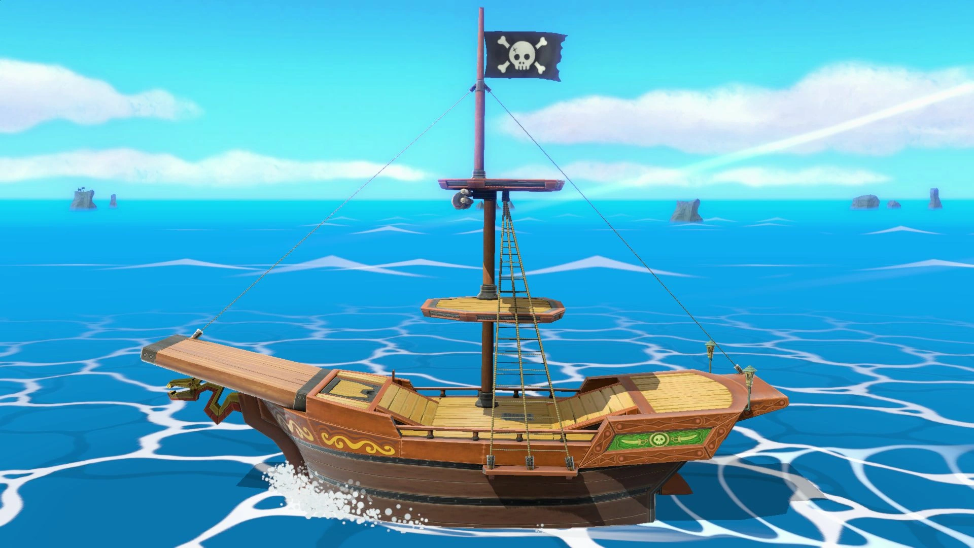 The ship itself is a large solid platform with a dip in the middle to model after the actual Pirate Ship from Wind Waker. It slants back up on the left side where the bow of the ship is. Above the middle section of the ship are two smaller platforms for the crow’s nest which can be fought on.