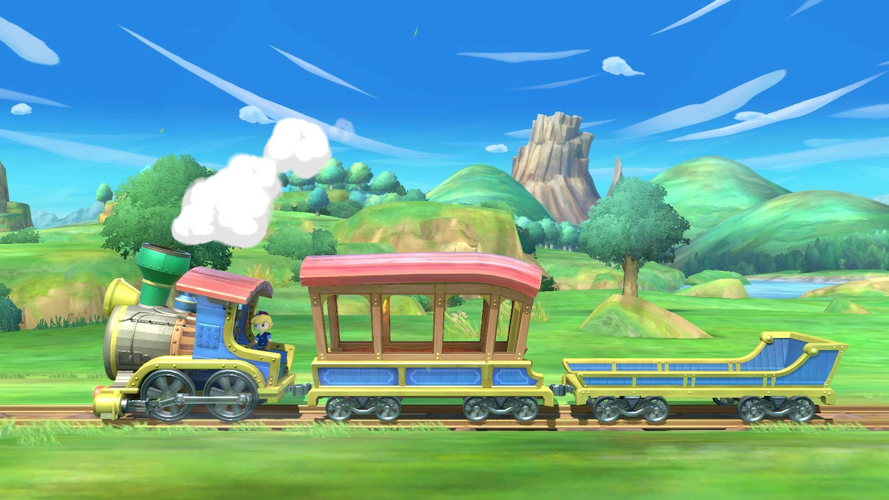 If you see the Spirit Train backing up towards the right side of the screen and you’re on the carriage… you should probably move as that carriage is about to go past the blast zones. The train will remain in this position for a few seconds before it begins to pull back forwards with a completely different carriage being pulled behind it. There are five different kinds of carriage that the Spirit Train can hold.