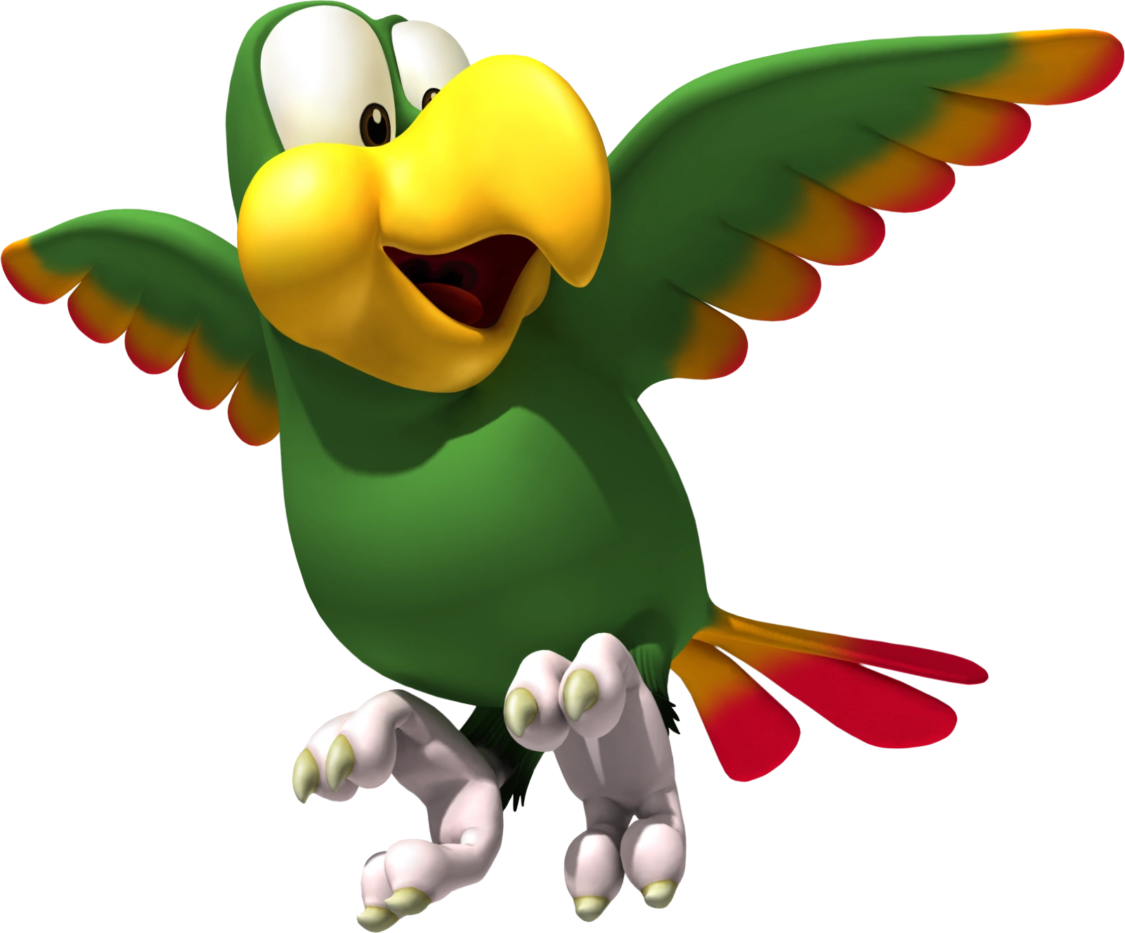 Squawks the Parrot is one of several Animal Buddies in the DK franchise and of them all, Squawks has the most tasks that he performs in the games. In the original Donkey Kong Country Squawks was only featured in the level Torchlight Trouble where he carried a lantern to help light up the path in a pitch-dark cavern. Squawks' role was significantly increased in the following game where he would appear in several levels. Some would allow the player to control Squawks and use him to attack enemies by shooting eggs at them while other levels he is used to carry the Kongs over a great distance. Squawks is even present during a boss battle where he is used to fight King Zing!