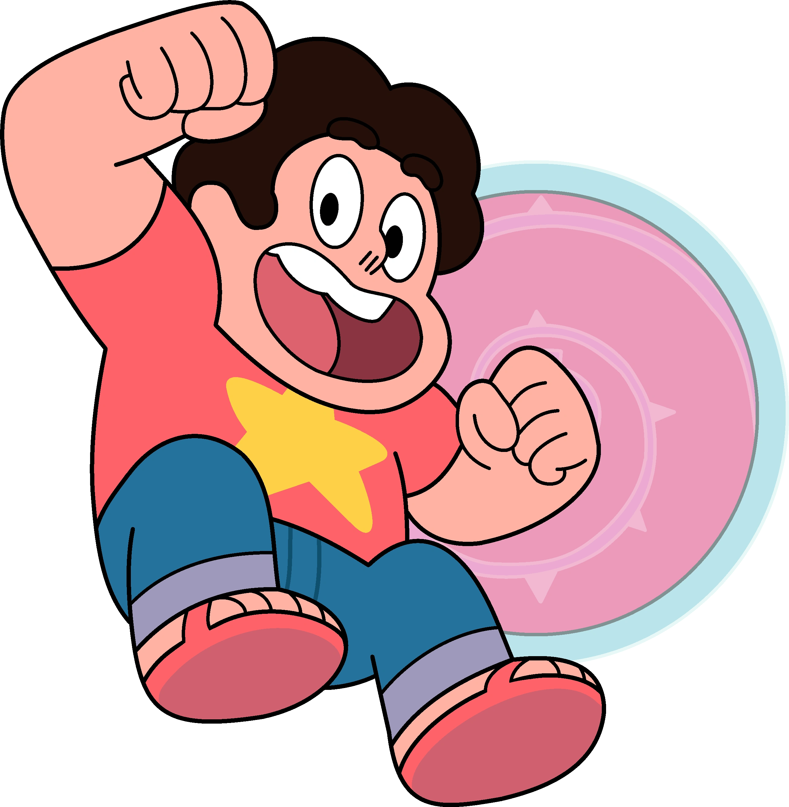 Steven Universe is a Gem-human hybrid formed by the union of Rose Quartz and Greg Universe. Gems are an alien race projected from a magical gemstone's refracting light, and many of them have been at-arms with the human race for eons. Steven joins Rose's old allies, the Crystal Gems — Garnet, Amethyst, and Pearl — in combatting primarily Gem-based threats and often working to show them the light. Steven's Rose Quartz gemstone is located on his belly button. He is frequently known for his puffy hair and star t-shirt, as well as his kind, loving demeanor and disregard for gender norms. Throughout the Steven Universe shows and movie, Steven takes the role of protagonist, and most of the franchise is seen uniquely through his perspective.